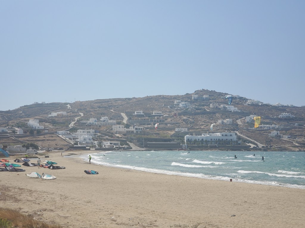 Kappari was first because it was the closest and in the opposite direction of the other two. The beach itself was very easy to find, you more or less had to just follow the road out of Mykonos and stay on it minus one semi-crowded roundabout. Additionally you will pass by 1 larger, more popular beach used by wind surfers, which was very cool to watch. Once you go up a hill and hit the dirt path you’ll notice a lot of people in beachware walking along the path to the same destination. At the end of the dirt path you’ll find motorcycles and other atvs parked and this is where you’ll leave you vehicle.
