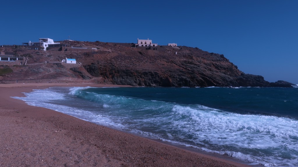 At this point though I had hit my limit of finding some secret beaches. I just wanted to sit and relax and this beach was also very nice and empty except for a surfer and their incredibly friendly dog which I played with for awhile while they caught some waves. Paralia Pano Tigani definitely feels like a hidden beach still if not so completely it required offroading but perhaps next time I’m in Mykonos I’ll find the more remote one. In the meantime I was quite satisfied with just sitting on this beach, watching this surfer, and playing with this dog. During my entire time on this beach, nobody else showed up and it was great! Several people came out from the villas to look at the water briefly then left. After some time I did have to get back to my friends and I said goodbye to my new dog friend and headed back.