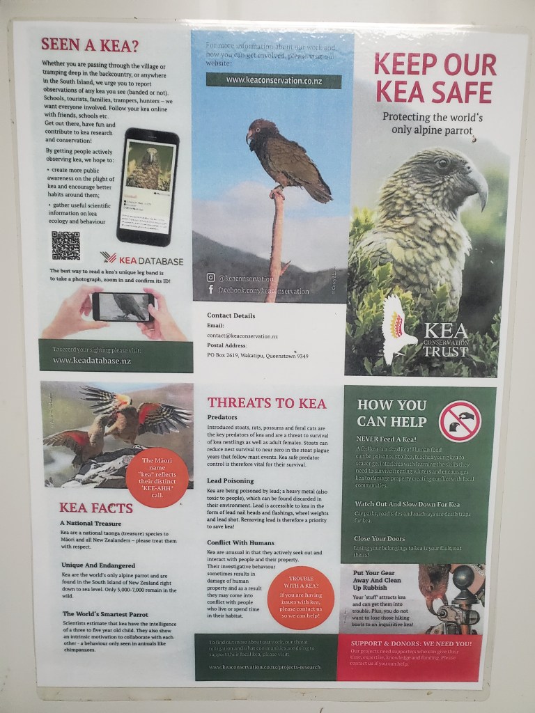 You see, in most pull-off locations on the drive into Milford Sound, you will see at least one of these gigantic parrots. They will likely get close to your car and very even possibly start to pull apart the lining on your vehicle. In fact, some rental companies won’t even rent a car to you if you say you are going to Milford Sound for that very reason. These birds will crawl about your vehicle, even make a quick trip inside it if you are not careful, steal all your delicious treats. Here is a paper I found in a public toilet that I don’t doubt has a ton more Kea facts.